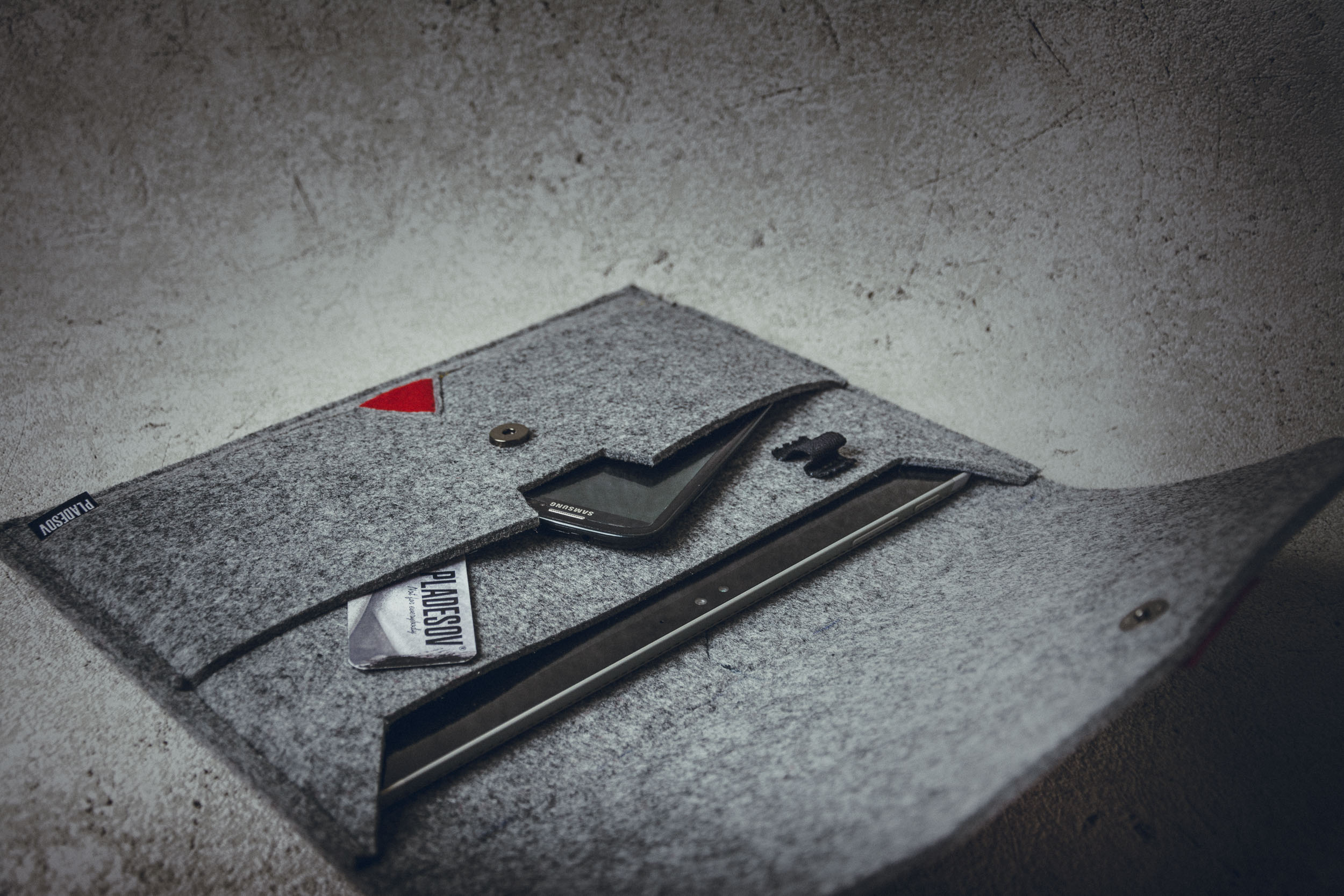 Dies ist ein extravagantes Zubehör, das Ihr elektronisches Gerät schützt. Hergestellt aus 5 mm dickem Filz, langlebig und fühlt sich weich an. Hergestellt in Nordeuropa von einer Person. Dies ist ein aufstrebender Designer. Private europäische Marke PLADESOV. Einzigartige Kleidung direkt vom Designer für die Arbeiterklasse. Hand- und Maschinenarbeit. Ohne Vermittler.